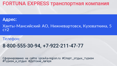 FORTUNA EXPRESS, транспортная компания по адресу Ханты-Мансийский АО, Нижневартовск, Кузоваткина, 5 ст2 в дальнейшем Организация, размещена в следующих категориях: