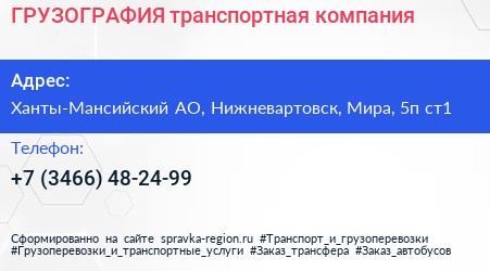 ГРУЗОГРАФИЯ, транспортная компания по адресу Ханты-Мансийский АО, Нижневартовск, Мира, 5п ст1 в дальнейшем Организация, размещена в следующих категориях:
