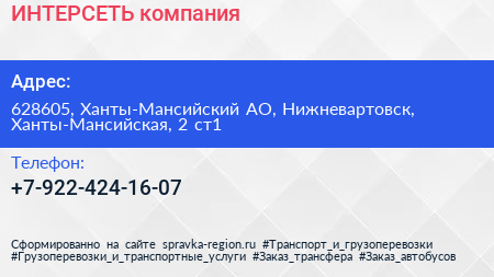 ИНТЕРСЕТЬ, компания по адресу 628605, Ханты-Мансийский АО, Нижневартовск, Ханты-Мансийская, 2 ст1 в дальнейшем Организация, размещена в следующих категориях:
