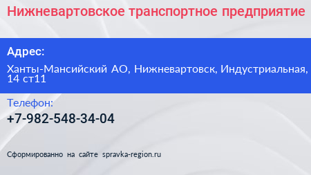 Нижневартовское транспортное предприятие по адресу Ханты-Мансийский АО, Нижневартовск, Индустриальная, 14 ст11 в дальнейшем Организация, размещена в следующих категориях:
