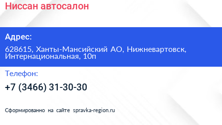 Ниссан, автосалон по адресу 628615, Ханты-Мансийский АО, Нижневартовск, Интернациональная, 10п в дальнейшем Организация, размещена в следующих категориях: