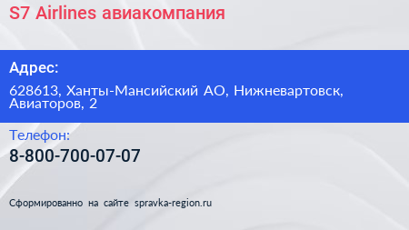 S7 Airlines, авиакомпания по адресу 628613, Ханты-Мансийский АО, Нижневартовск, Авиаторов, 2 в дальнейшем Организация, размещена в следующих категориях: