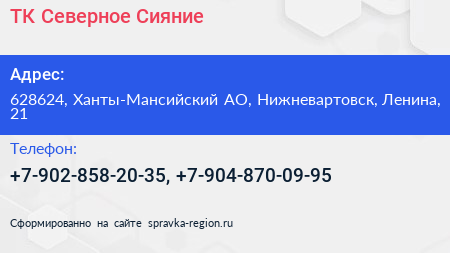 ТК Северное Сияние по адресу 628624, Ханты-Мансийский АО, Нижневартовск, Ленина, 21 в дальнейшем Организация, размещена в следующих категориях: