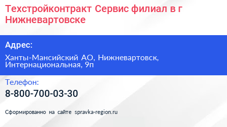 Техстройконтракт-Сервис, филиал в г. Нижневартовске по адресу Ханты-Мансийский АО, Нижневартовск, Интернациональная, 9п в дальнейшем Организация, размещена в следующих категориях: