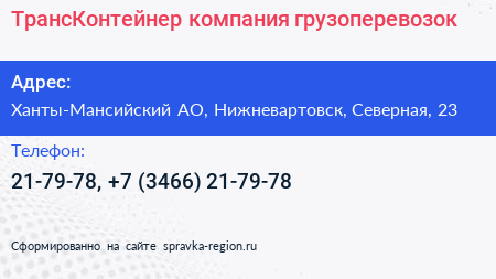 ТрансКонтейнер, компания грузоперевозок по адресу Ханты-Мансийский АО, Нижневартовск, Северная, 23 в дальнейшем Организация, размещена в следующих категориях:
