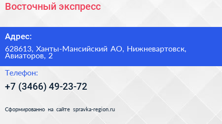 Восточный экспресс по адресу 628613, Ханты-Мансийский АО, Нижневартовск, Авиаторов, 2 в дальнейшем Организация, размещена в следующих категориях: