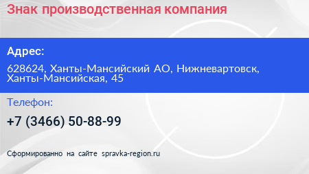 Знак, производственная компания по адресу 628624, Ханты-Мансийский АО, Нижневартовск, Ханты-Мансийская, 45 в дальнейшем Организация, размещена в следующих категориях: