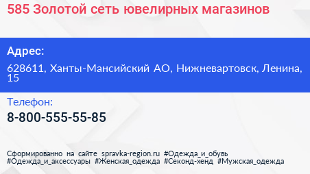 585* Золотой, сеть ювелирных магазинов по адресу 628611, Ханты-Мансийский АО, Нижневартовск, Ленина, 15 в дальнейшем Организация, размещена в следующих категориях: