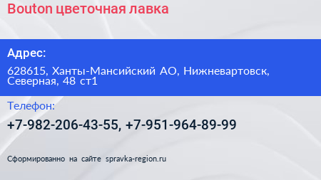 Bouton, цветочная лавка по адресу 628615, Ханты-Мансийский АО, Нижневартовск, Северная, 48 ст1 в дальнейшем Организация, размещена в следующих категориях: