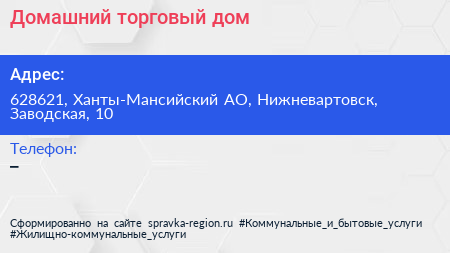 Домашний, торговый дом по адресу 628621, Ханты-Мансийский АО, Нижневартовск, Заводская, 10 в дальнейшем Организация, размещена в следующих категориях: