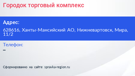 Городок, торговый комплекс по адресу 628616, Ханты-Мансийский АО, Нижневартовск, Мира, 11/2 в дальнейшем Организация, размещена в следующих категориях: