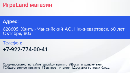 ИграLand, магазин по адресу 628605, Ханты-Мансийский АО, Нижневартовск, 60 лет Октября, 80а в дальнейшем Организация, размещена в следующих категориях: