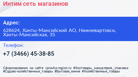 Интим, сеть магазинов по адресу 628624, Ханты-Мансийский АО, Нижневартовск, Ханты-Мансийская, 35 в дальнейшем Организация, размещена в следующих категориях: