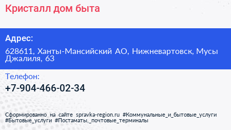 Кристалл, дом быта по адресу 628611, Ханты-Мансийский АО, Нижневартовск, Мусы Джалиля, 63 в дальнейшем Организация, размещена в следующих категориях: