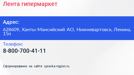 Лента, гипермаркет по адресу 628609, Ханты-Мансийский АО, Нижневартовск, Ленина, 15п в дальнейшем Организация, размещена в следующих категориях: