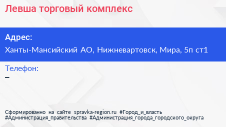 Левша, торговый комплекс по адресу Ханты-Мансийский АО, Нижневартовск, Мира, 5п ст1 в дальнейшем Организация, размещена в следующих категориях: