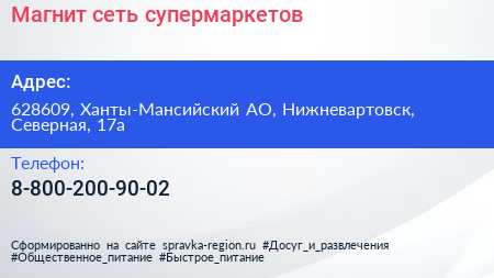 Магнит, сеть супермаркетов по адресу 628609, Ханты-Мансийский АО, Нижневартовск, Северная, 17а в дальнейшем Организация, размещена в следующих категориях:
