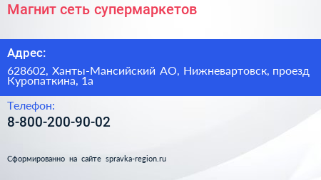 Магнит, сеть супермаркетов по адресу 628602, Ханты-Мансийский АО, Нижневартовск, проезд Куропаткина, 1а в дальнейшем Организация, размещена в следующих категориях: