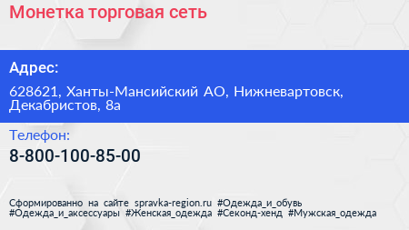 Монетка, торговая сеть по адресу 628621, Ханты-Мансийский АО, Нижневартовск, Декабристов, 8а в дальнейшем Организация, размещена в следующих категориях: