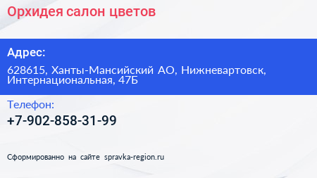 Орхидея, салон цветов по адресу 628615, Ханты-Мансийский АО, Нижневартовск, Интернациональная, 47Б в дальнейшем Организация, размещена в следующих категориях: