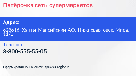 Пятёрочка, сеть супермаркетов по адресу 628616, Ханты-Мансийский АО, Нижневартовск, Мира, 11/1 в дальнейшем Организация, размещена в следующих категориях: