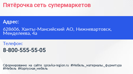 Пятёрочка, сеть супермаркетов по адресу 628606, Ханты-Мансийский АО, Нижневартовск, Менделеева, 4а в дальнейшем Организация, размещена в следующих категориях: