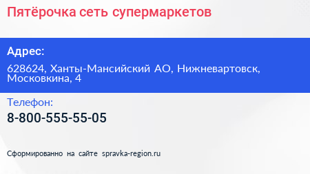 Пятёрочка, сеть супермаркетов по адресу 628624, Ханты-Мансийский АО, Нижневартовск, Московкина, 4 в дальнейшем Организация, размещена в следующих категориях:
