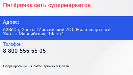 Пятёрочка, сеть супермаркетов по адресу 628605, Ханты-Мансийский АО, Нижневартовск, Ханты-Мансийская, 14а ст1 в дальнейшем Организация, размещена в следующих категориях: