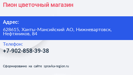 Пион, цветочный магазин по адресу 628615, Ханты-Мансийский АО, Нижневартовск, Нефтяников, 84 в дальнейшем Организация, размещена в следующих категориях: