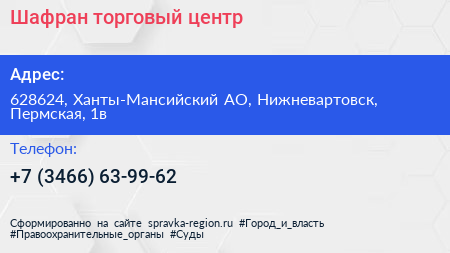 Шафран, торговый центр по адресу 628624, Ханты-Мансийский АО, Нижневартовск, Пермская, 1в в дальнейшем Организация, размещена в следующих категориях:
