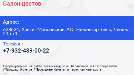 Салон цветов по адресу 628624, Ханты-Мансийский АО, Нижневартовск, Ленина, 23 ст1 в дальнейшем Организация, размещена в следующих категориях: