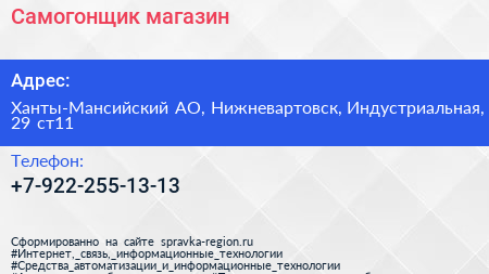 Самогонщик, магазин по адресу Ханты-Мансийский АО, Нижневартовск, Индустриальная, 29 ст11 в дальнейшем Организация, размещена в следующих категориях: