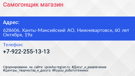 Самогонщик, магазин по адресу 628606, Ханты-Мансийский АО, Нижневартовск, 60 лет Октября, 19а в дальнейшем Организация, размещена в следующих категориях: