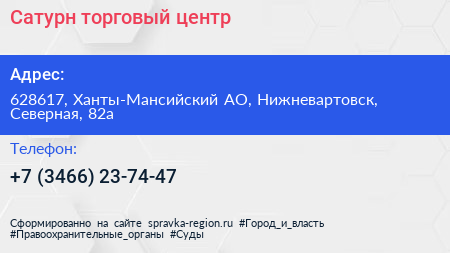 Сатурн, торговый центр по адресу 628617, Ханты-Мансийский АО, Нижневартовск, Северная, 82а в дальнейшем Организация, размещена в следующих категориях: