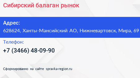 Сибирский балаган, рынок по адресу 628624, Ханты-Мансийский АО, Нижневартовск, Мира, 69 в дальнейшем Организация, размещена в следующих категориях: