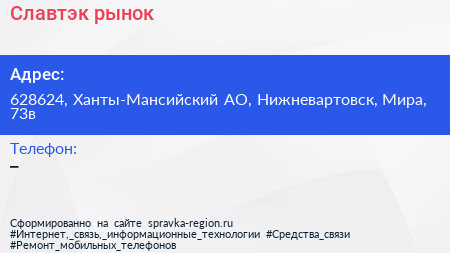 Славтэк, рынок по адресу 628624, Ханты-Мансийский АО, Нижневартовск, Мира, 73в в дальнейшем Организация, размещена в следующих категориях: