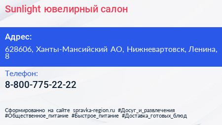 Sunlight, ювелирный салон по адресу 628606, Ханты-Мансийский АО, Нижневартовск, Ленина, 8 в дальнейшем Организация, размещена в следующих категориях:
