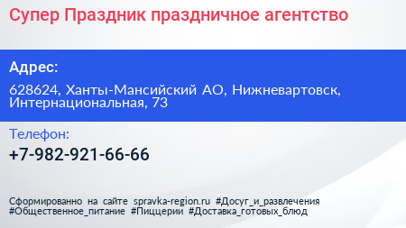 Супер Праздник, праздничное агентство по адресу 628624, Ханты-Мансийский АО, Нижневартовск, Интернациональная, 73 в дальнейшем Организация, размещена в следующих категориях: