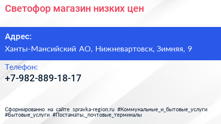 Светофор, магазин низких цен по адресу Ханты-Мансийский АО, Нижневартовск, Зимняя, 9 в дальнейшем Организация, размещена в следующих категориях: