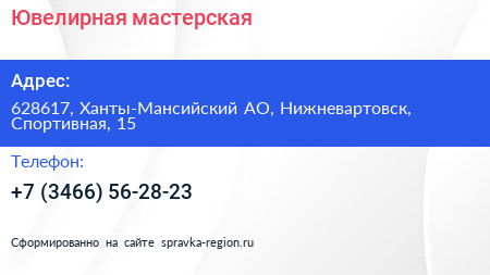Ювелирная мастерская по адресу 628617, Ханты-Мансийский АО, Нижневартовск, Спортивная, 15 в дальнейшем Организация, размещена в следующих категориях: