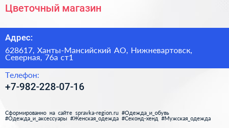 Цветочный магазин по адресу 628617, Ханты-Мансийский АО, Нижневартовск, Северная, 76а ст1 в дальнейшем Организация, размещена в следующих категориях: