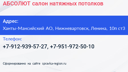 АБСОЛЮТ, салон натяжных потолков по адресу Ханты-Мансийский АО, Нижневартовск, Ленина, 10п ст3 в дальнейшем Организация, размещена в следующих категориях:
