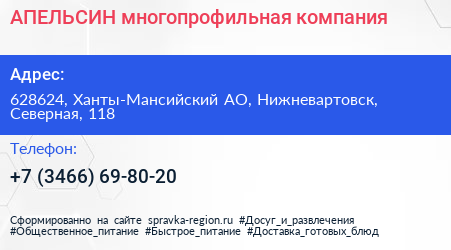 АПЕЛЬСИН, многопрофильная компания по адресу 628624, Ханты-Мансийский АО, Нижневартовск, Северная, 118 в дальнейшем Организация, размещена в следующих категориях: