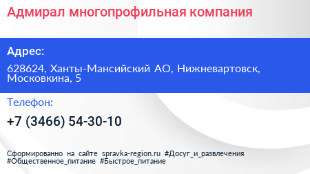 Адмирал, многопрофильная компания по адресу 628624, Ханты-Мансийский АО, Нижневартовск, Московкина, 5 в дальнейшем Организация, размещена в следующих категориях: