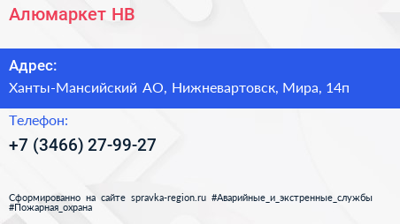 Алюмаркет НВ по адресу Ханты-Мансийский АО, Нижневартовск, Мира, 14п в дальнейшем Организация, размещена в следующих категориях: