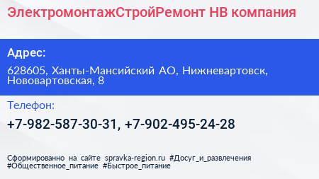 ЭлектромонтажСтройРемонт-НВ, компания по адресу 628605, Ханты-Мансийский АО, Нижневартовск, Нововартовская, 8 в дальнейшем Организация, размещена в следующих категориях: