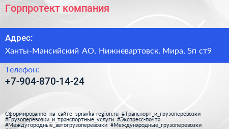 Горпротект, компания по адресу Ханты-Мансийский АО, Нижневартовск, Мира, 5п ст9 в дальнейшем Организация, размещена в следующих категориях: