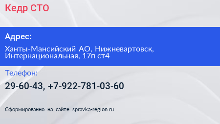 Кедр, СТО по адресу Ханты-Мансийский АО, Нижневартовск, Интернациональная, 17п ст4 в дальнейшем Организация, размещена в следующих категориях: