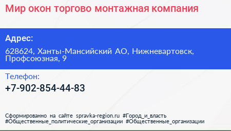 Мир окон, торгово-монтажная компания по адресу 628624, Ханты-Мансийский АО, Нижневартовск, Профсоюзная, 9 в дальнейшем Организация, размещена в следующих категориях: