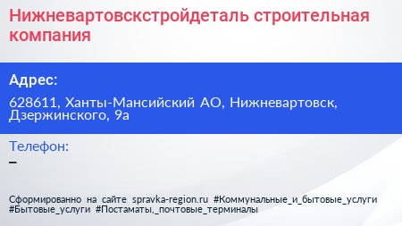 Нижневартовскстройдеталь, строительная компания по адресу 628611, Ханты-Мансийский АО, Нижневартовск, Дзержинского, 9а в дальнейшем Организация, размещена в следующих категориях: